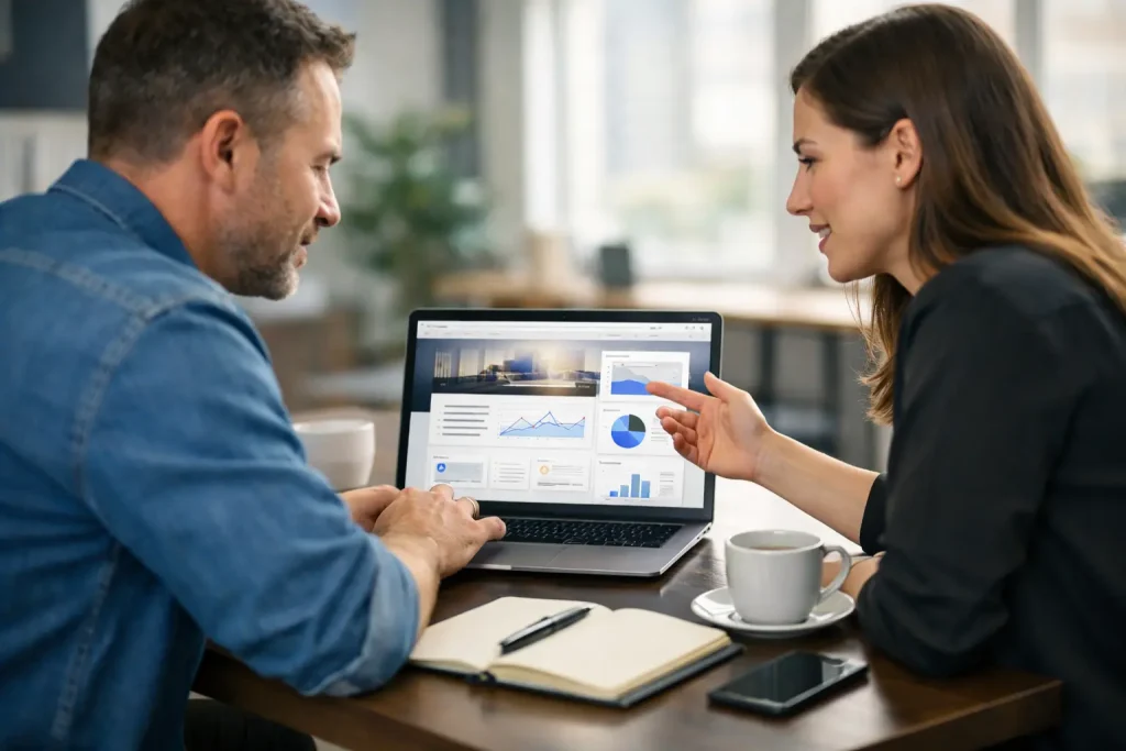 Business owner reviewing manual penalty warning with SEO company in Houston during website recovery audit